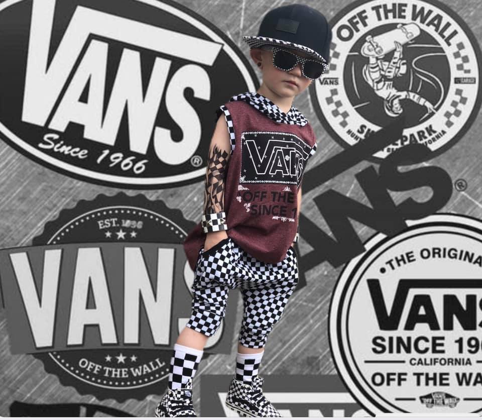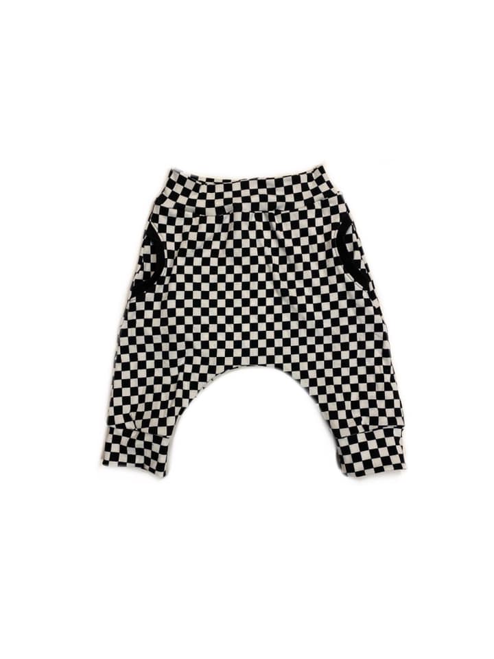 The Checkered Grunge shorts are made of black and white cotton lycra knit. The pockets are black and white checkered knit with a black accent pocket band.