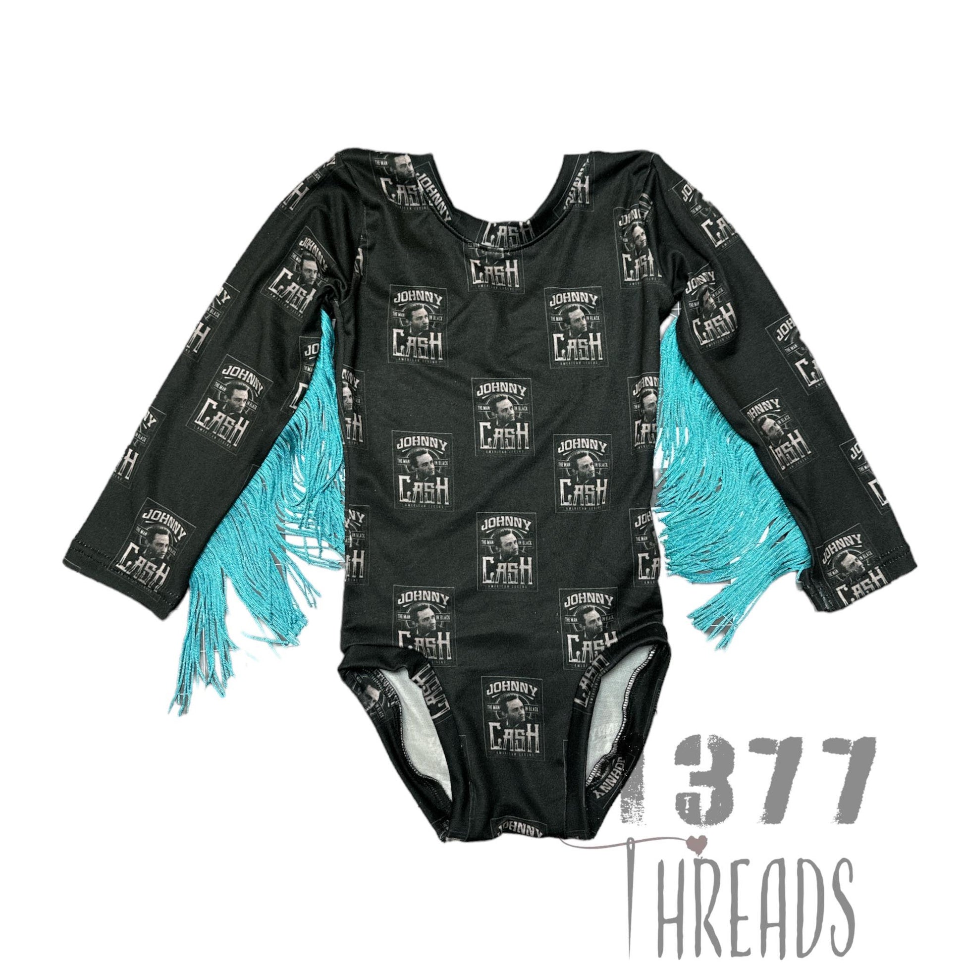 This printed bodysuit has long sleeves with sewn in fringe down the arms.