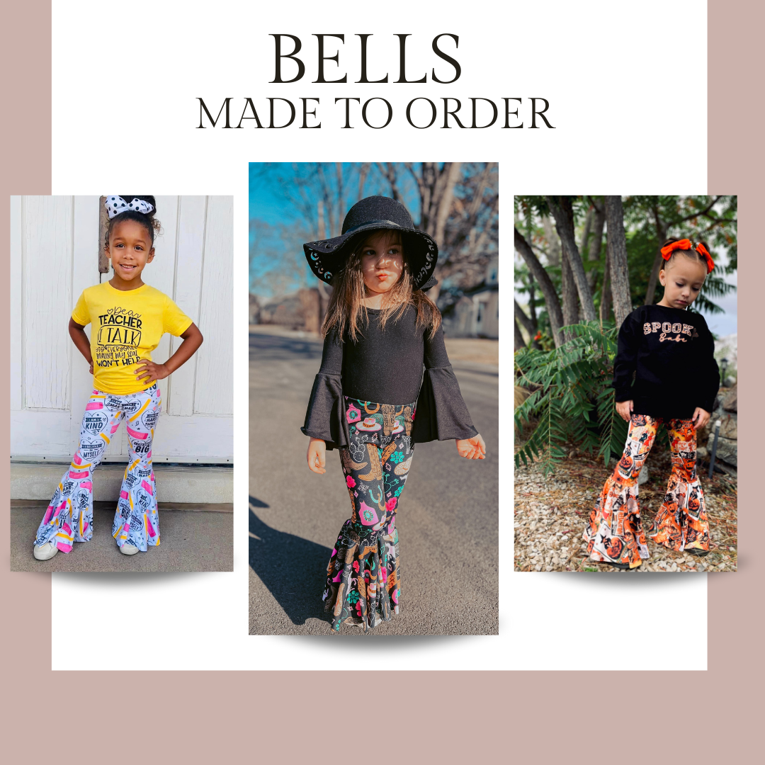 The pleated bells are a fun nod to the past and always get attention with their style. They are a snug fit around the butt and thigh area with a wide pleaded bell about mid calf and down.