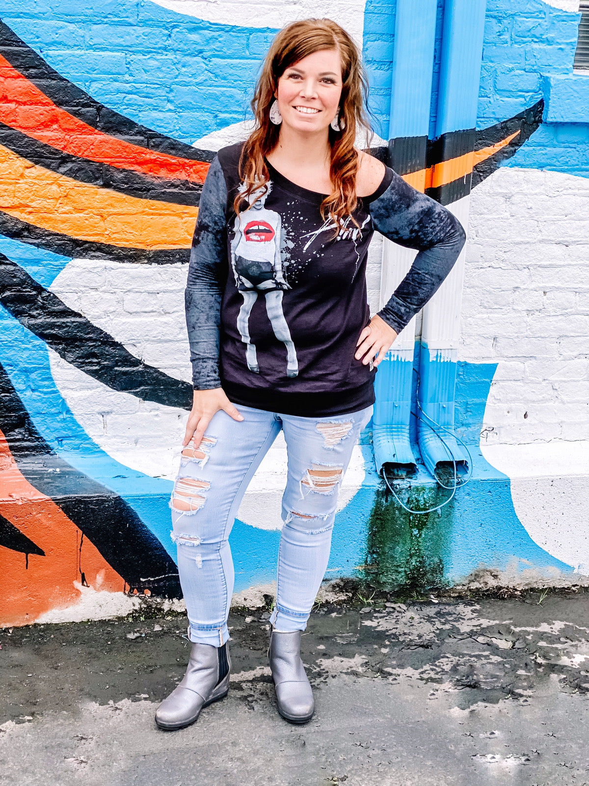 The Off the Shoulder top is a fun design for any of us. The design will determine which shoulder it sits off of and will have a coordinating fabric on the back. The bottom has a waistband and come as a tshirt length. Please feel free to request a longer length in the buyer notes and leave any additional design requests.