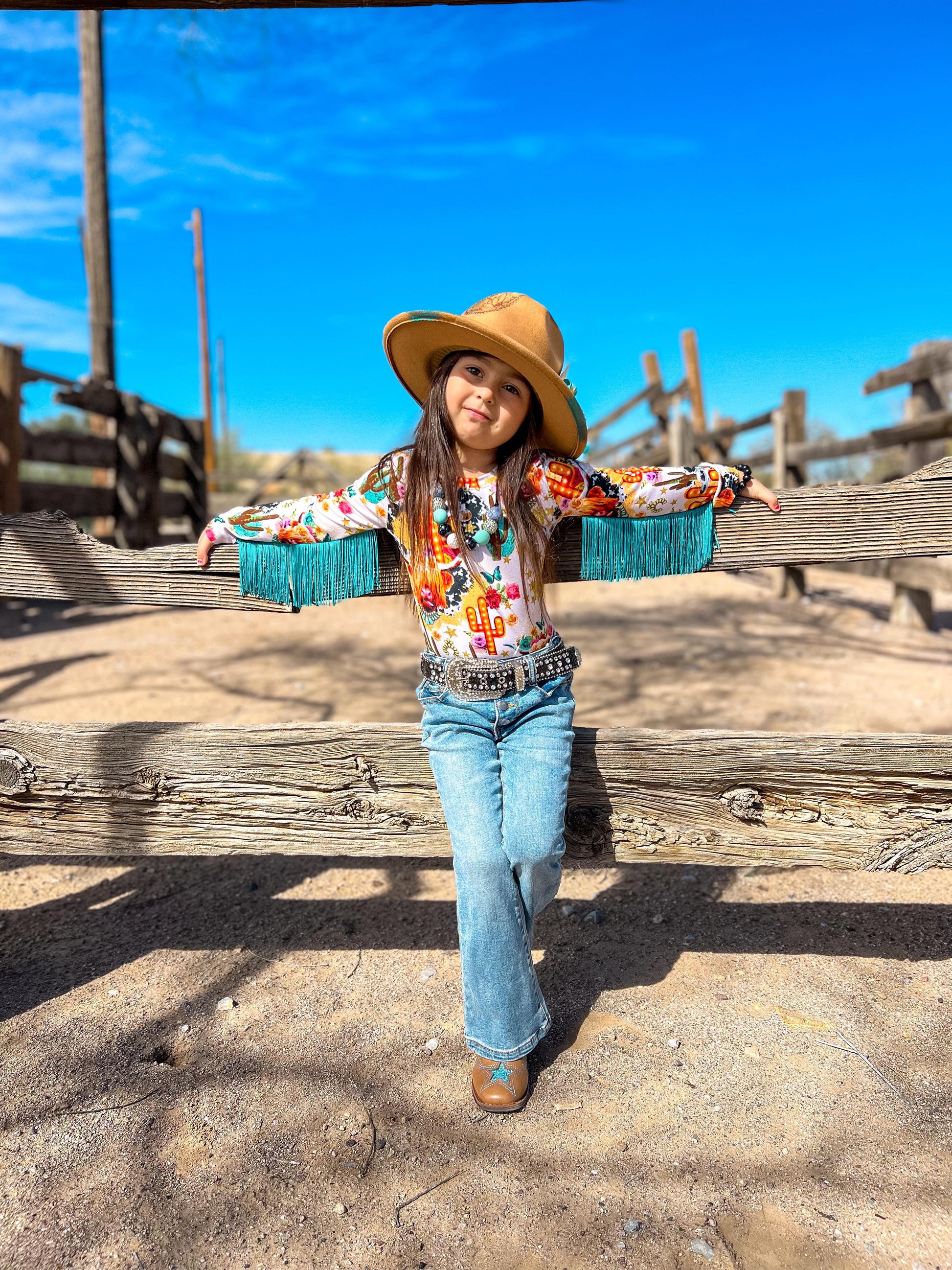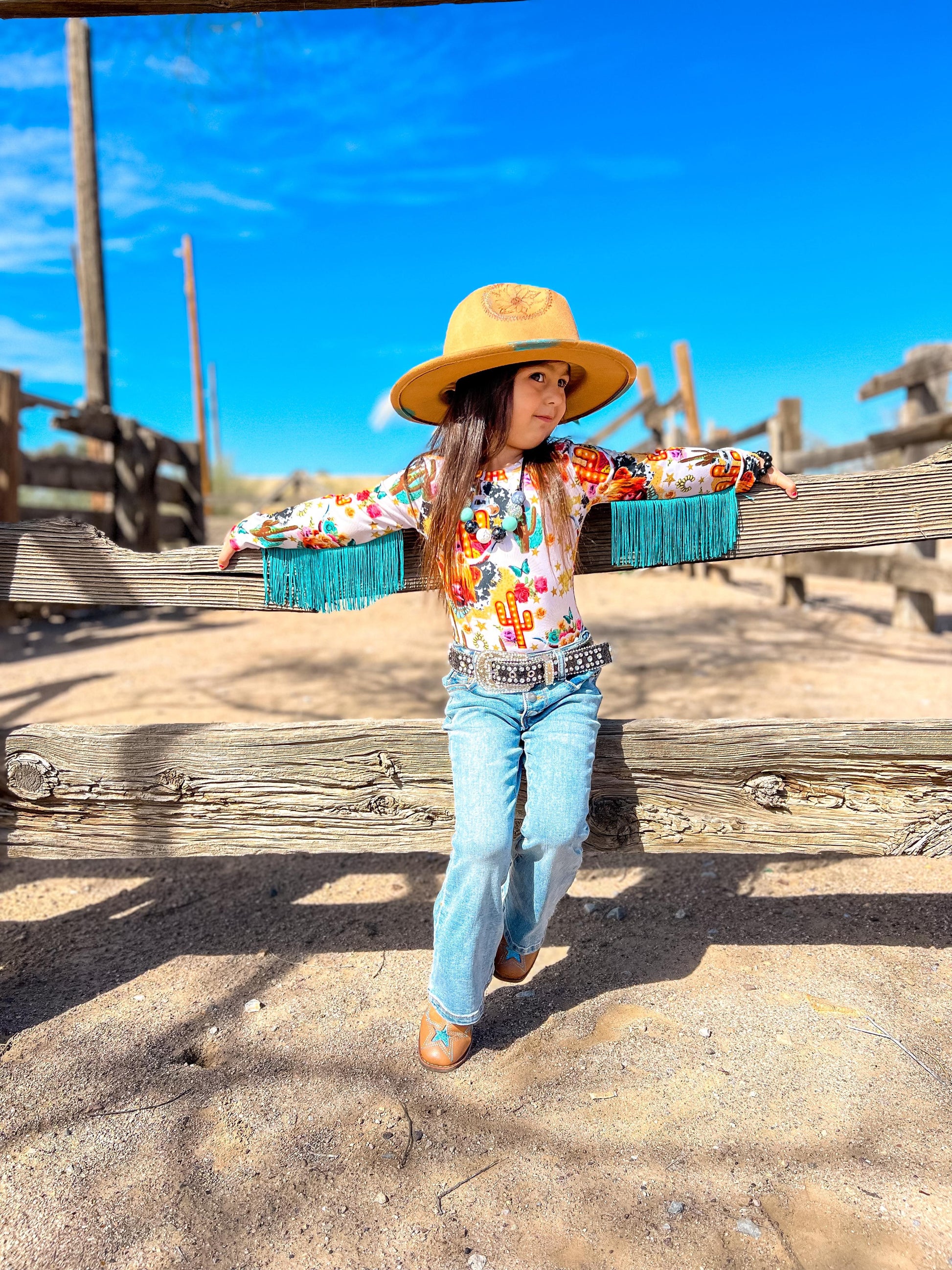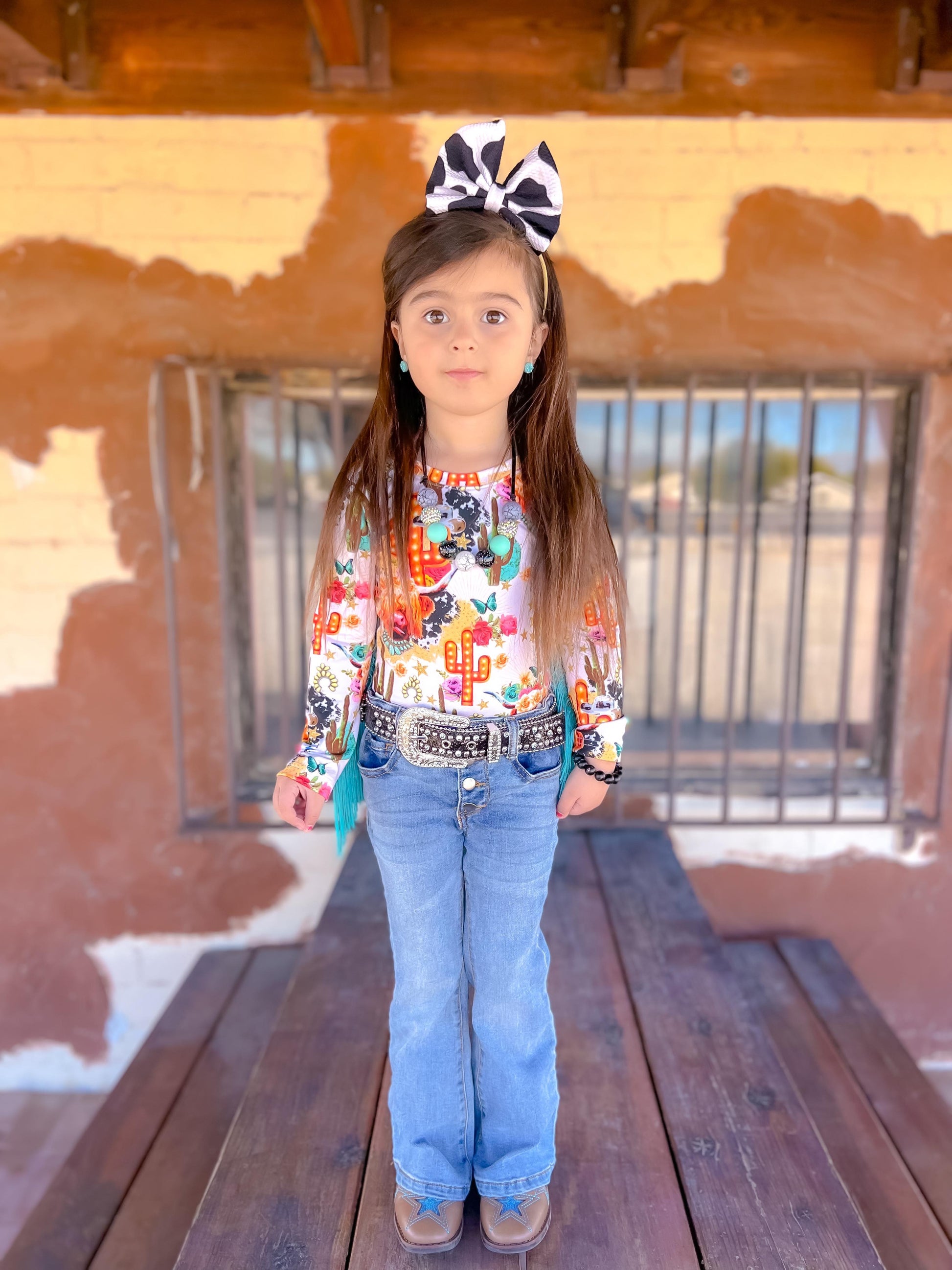 This Cow printed bodysuit has long sleeves with sewn in fringe down the arms.