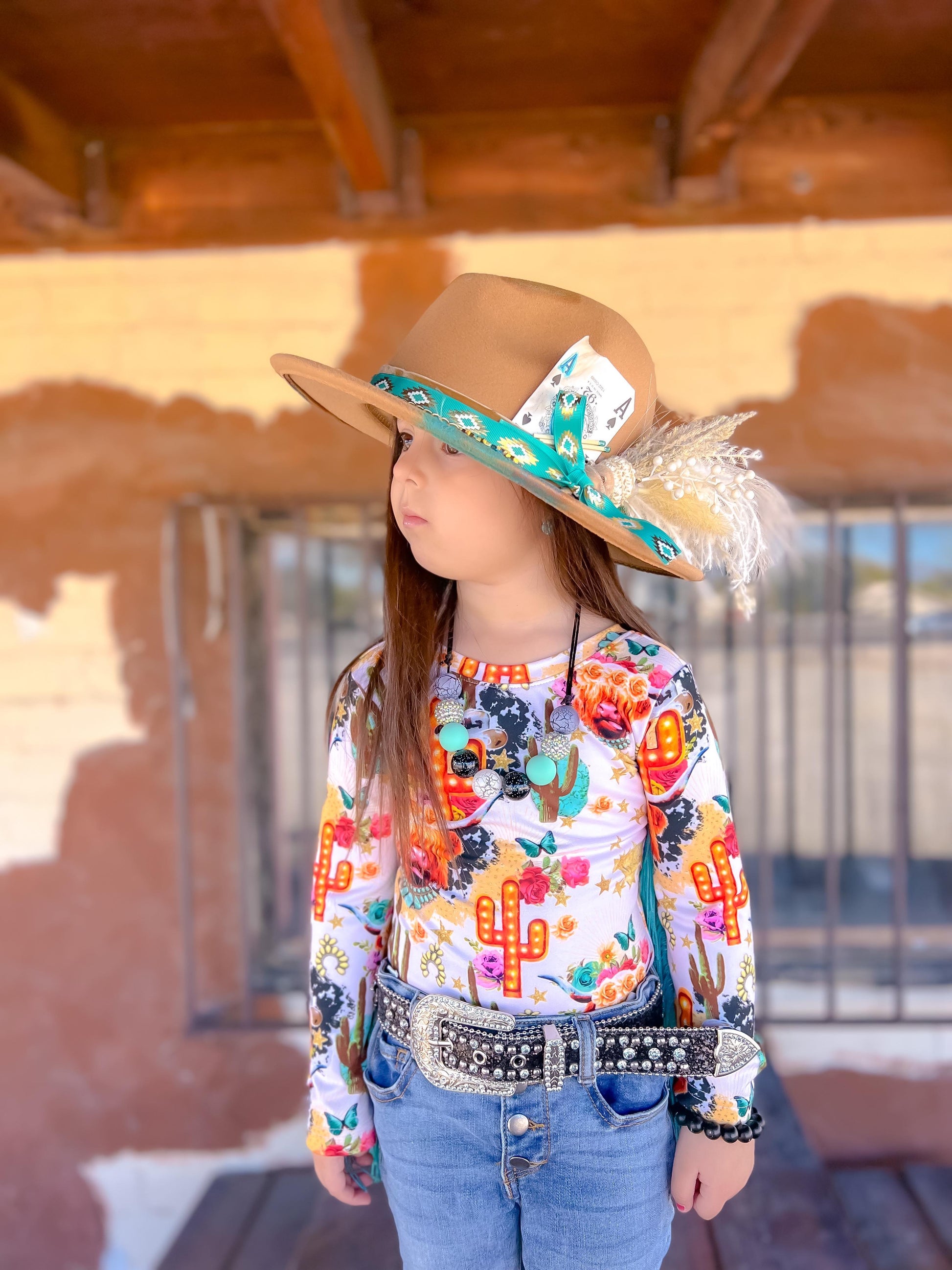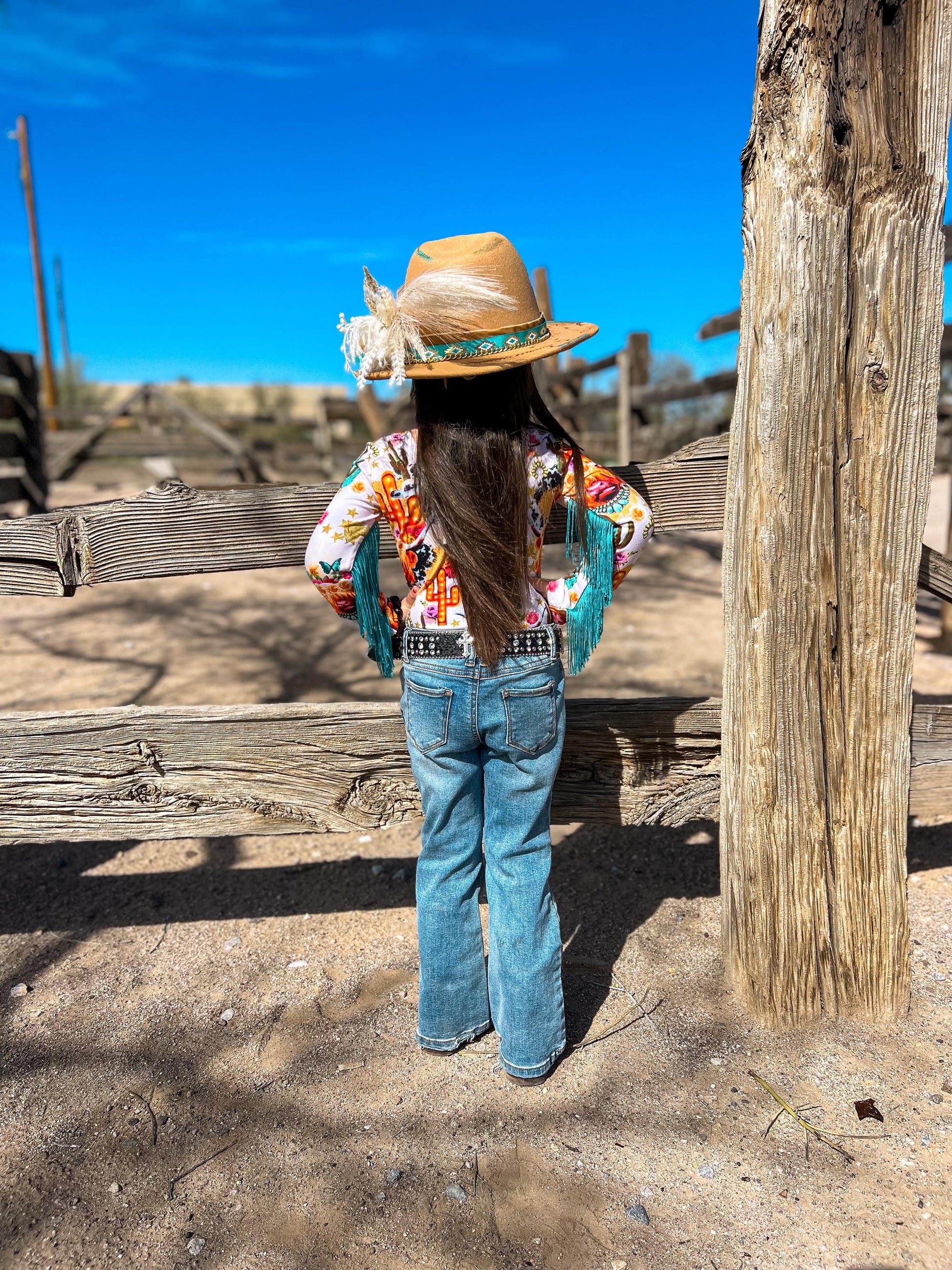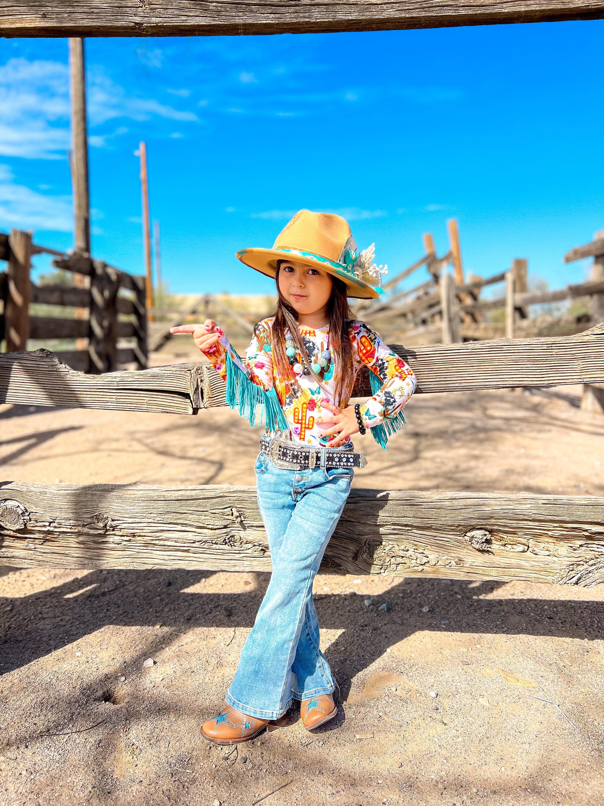 This Cow printed bodysuit has long sleeves with sewn in fringe down the arms.